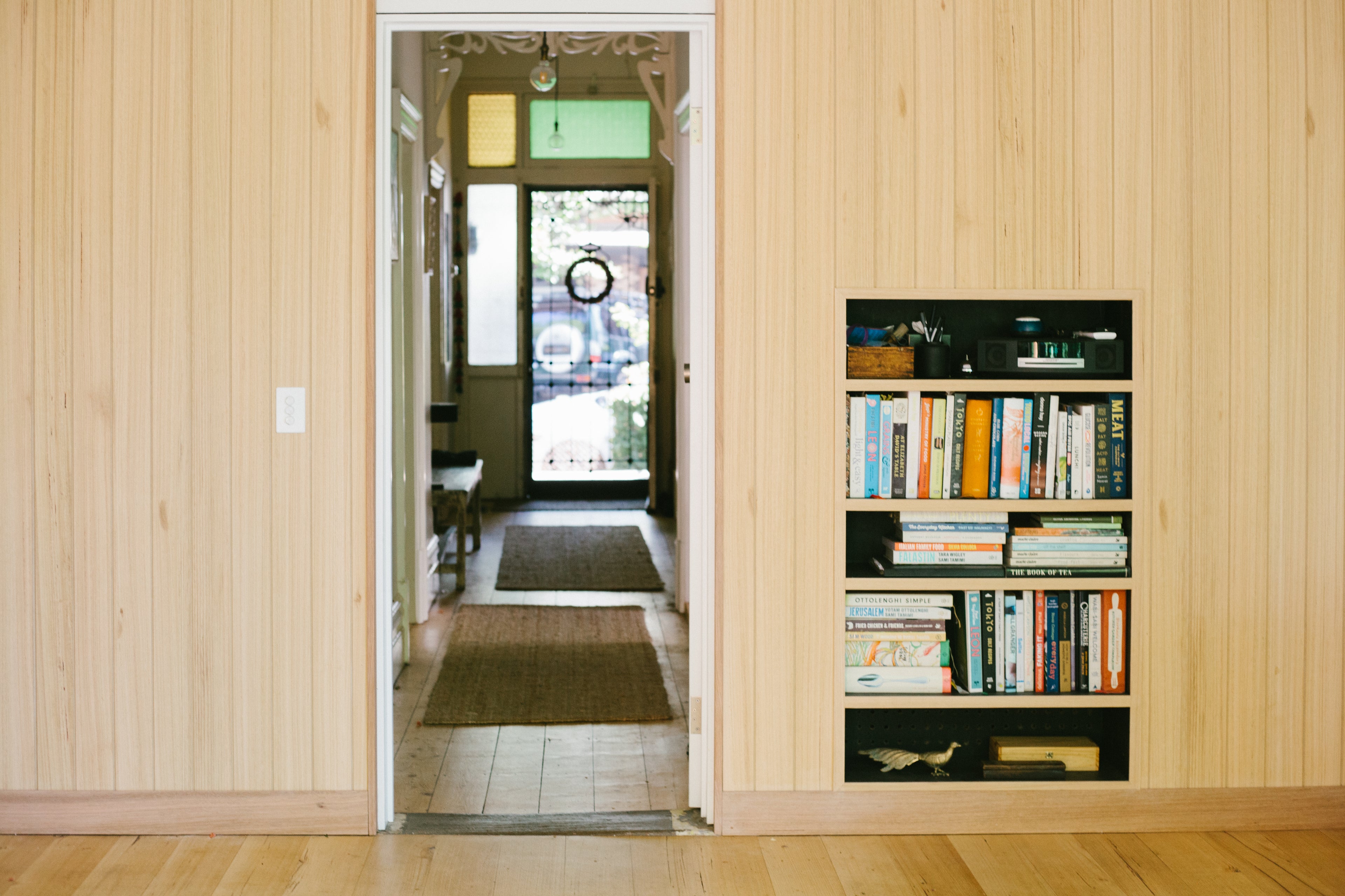 Built to conceal a plasterboard wall, the client wanted something simple, yet impactful. Details like a hand-curved corner and custom-milled mouldings provide seamless integration with existing features.